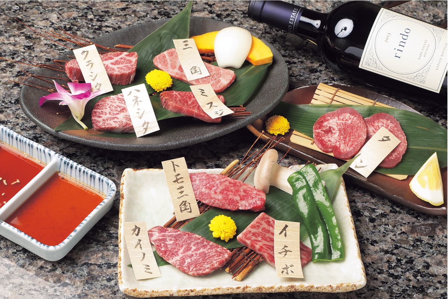 -Appetizer, Salad, Roast Beef, 3-Piece Steak Platter (Flapjack, Top Blade, and Aitchbone), Kimchi, 3-Piece Steak Platter (Tenderloin, Tongue, and Sirloin), Seared Beef Nigiri or Kimchi Rice, Miso Soup, Dessert